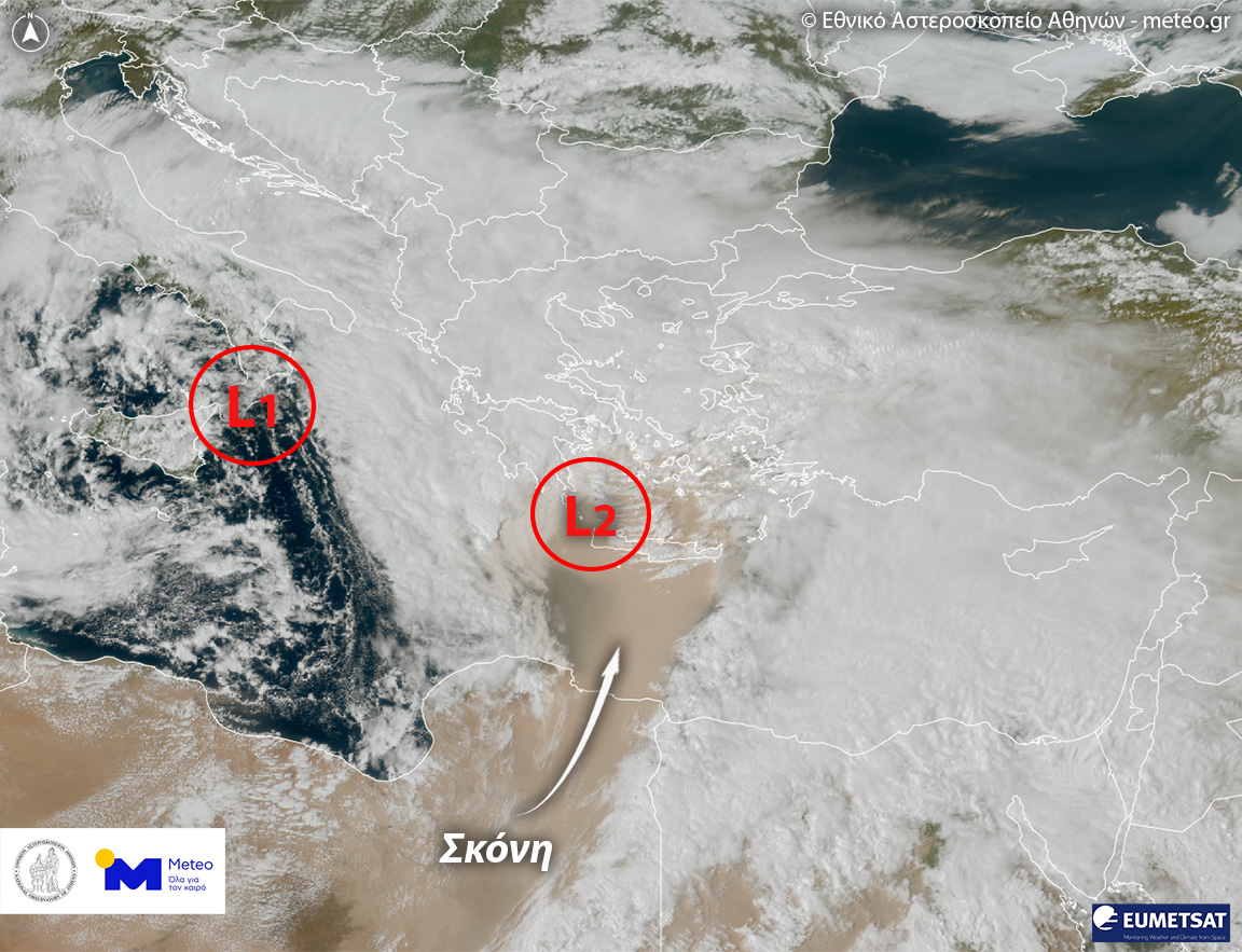Στη δορυφορική εικόνα του Meteosat-12 του Ευρωπαϊκού οργανισμού EUMETSAT, η οποία λήφθηκε κατά το πέρασμά του πάνω από την Ελλάδα την Τετάρτη 01 Απριλίου 2026, κατά την κορύφωση της κακοκαιρίας και του επεισοδίου σκόνης, διακρίνονται τόσο τα δύο βαρομετρικά χαμηλά (L1 και L2), όσο και το πέπλο αφρικανικής σκόνης με κατεύθυνση προς τη Νότια Ελλάδα.