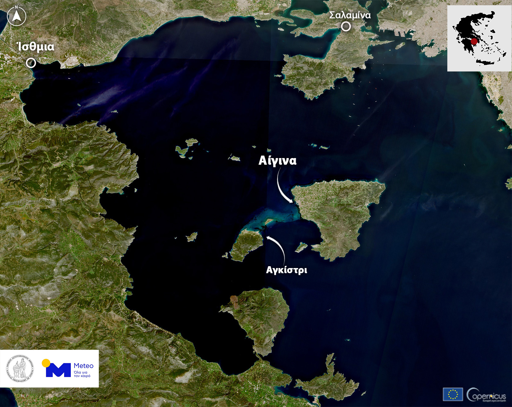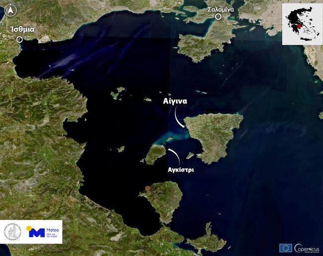 Στην παρακάτω δορυφορική εικόνα, η οποία απεικονίζει το νότιο Ιόνιο και το νοτιοδυτικό τμήμα της Πελοποννήσου, διακρίνονται οι εντυπωσιακοί σπειροειδείς σχηματισμοί γαλάζιας απόχρωσης στην επιφάνεια της θάλασσας. Οι εν λόγω επιφανειακές «δίνες» είναι απόρροια φερτών υλικών από τα ποτάμια της Πελοποννήσου που έχουν καταλήξει στο Ιόνιο και έχουν αναμιχθεί με ρεύματα που φέρουν διαφορετικές οπτικές ιδιότητες και οργανική ύλη.