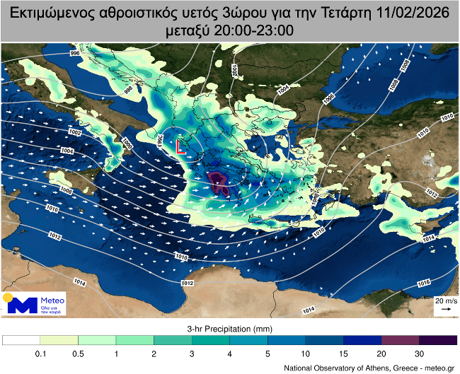 Στην παρακάτω ομάδα χαρτών παρουσιάζεται η θέση του βαρομετρικού χαμηλού και ο υετός 3ώρου μεταξύ 20:00-23:00 της Τετάρτης 11/02 και 02:00-05:00 της Πέμπτης 12/02.
