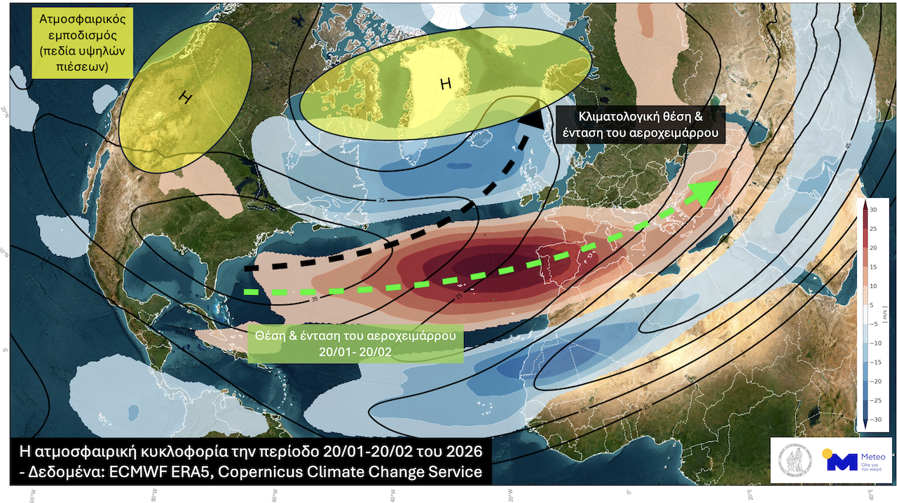 Όπως διακρίνεται και στην Εικόνα 1, η κλιματολογική μέση (αναμενόμενη) θέση του αεροχειμάρρου εκτείνεται από τις ανατολικές ακτές της Β. Αμερικής προς τον Βορειοανατολικό Ατλαντικό και τη Σκανδιναβία. Ωστόσο, το χρονικό διάστημα από τις 20 Ιανουαρίου έως τις 20 Φεβρουαρίου του 2026 ο αεροχείμαρρος ήταν εξασθενημένος στα βορειότερα τμήματα του Β. Ατλαντικού (μπλε αποχρώσεις στην Εικόνα 1) και πιο ισχυρός στα νότια τμήματα αυτού (κόκκινες αποχρώσεις στην Εικόνα 1) ενώ εκτεινόταν έως και την Ανατολική Μεσόγειο.