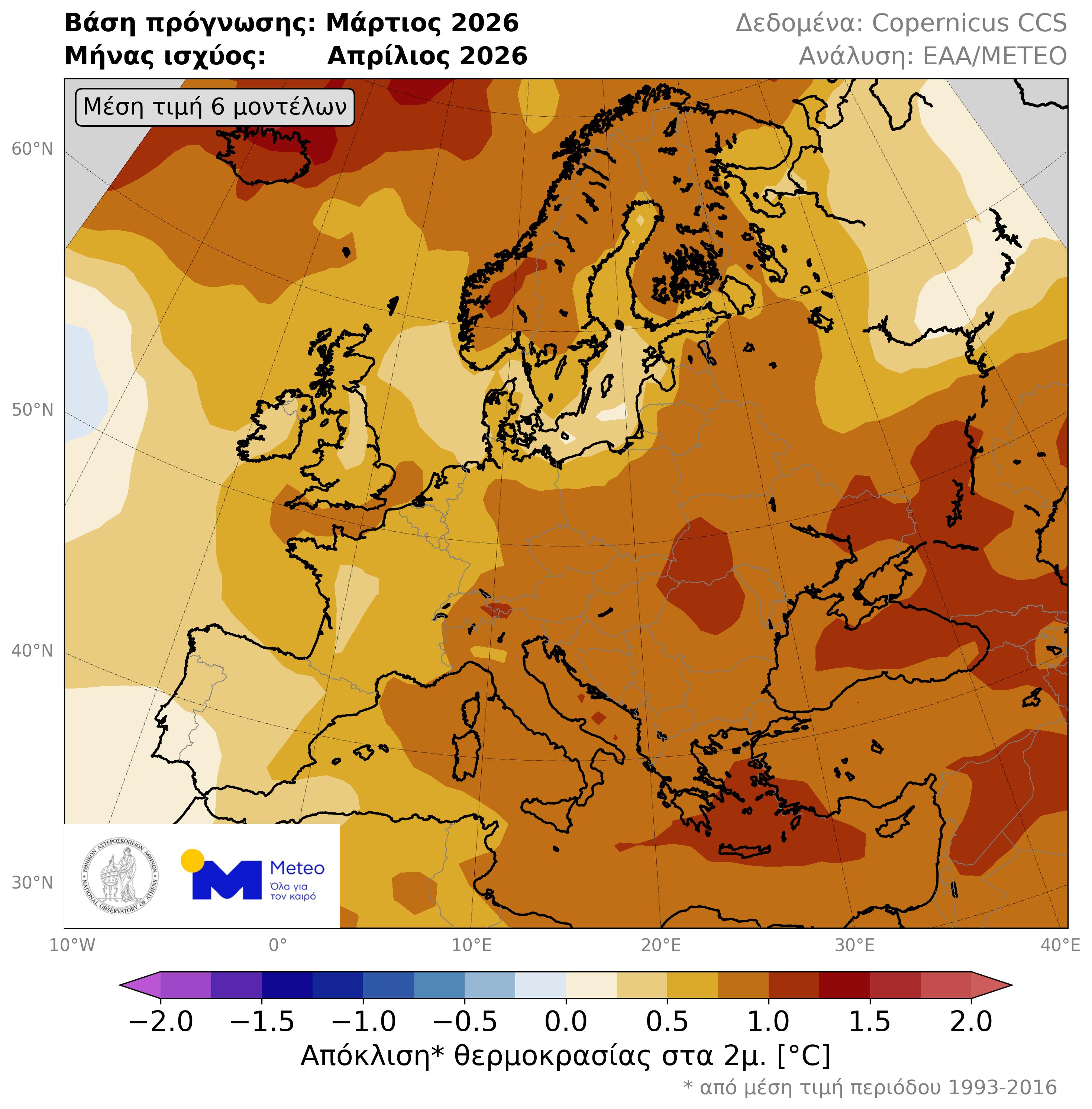 Εικόνα 2. Χάρτης απόκλισης της μέσης θερμοκρασίας Απριλίου 2026, σύμφωνα με την μέση τιμή των 300 μακροπρόθεσμων προγνώσεων που εκδόθηκαν αρχές Μαρτίου.
