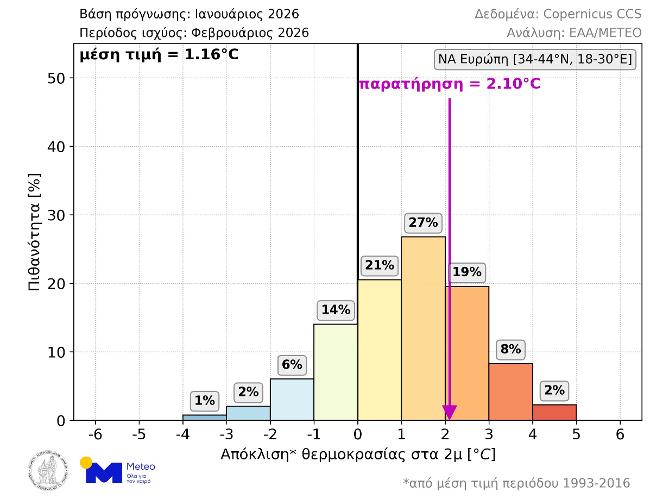 Όσον αφορά τον περασμένο Φεβρουάριο, η μέση θερμοκρασιακή απόκλιση στην ΝΑ Ευρώπη ήταν +2.10°C, ενώ η μέση τιμή όλων των σεναρίων της μακροπρόθεσμης πρόγνωσης που εκδόθηκε τον Ιανουάριο του 2026 ήταν +1.16°C. Όπως φαίνεται στο παρακάτω γράφημα (Εικόνα 3), το μέγεθος της απόκλισης που παρατηρήθηκε είχε πιθανότητα 19% και ήταν το τρίτο πιθανότερο πεδίο τιμών στην μακροπρόθεσμη πρόγνωση.