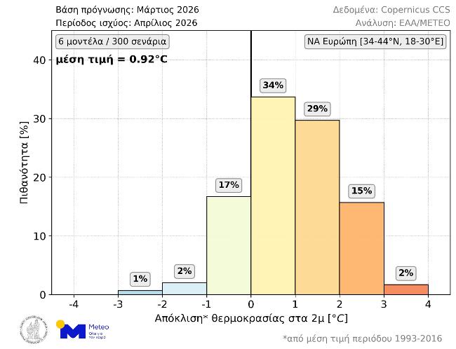Θερμότερος του κανονικού αναμένεται να είναι ο ερχόμενος Απρίλιος στην ΝΑ Ευρώπη (συμπεριλαμβανομένης της Ελλάδας) σύμφωνα με τις μακροπρόθεσμες προγνώσεις που εκδόθηκαν στις αρχές Μαρτίου. Όπως φαίνεται στο παρακάτω γράφημα (Εικόνα 1), σύμφωνα με το 80% των διαθέσιμων σεναρίων η μέση θερμοκρασία Απριλίου θα είναι υψηλότερη από τα κανονικά για την εποχή επίπεδα (περίοδος αναφοράς: 1993-2016). Συγκεκριμένα, η πιθανότητα για θετικές αποκλίσεις μεταξύ 0 και 1°C, μεταξύ 1 και 2°C και άνω των 2°C είναι 34%, 29% και 17% αντίστοιχα. Οι πιθανότητες για αρνητικές αποκλίσεις μεταξύ 0 και 1°C και άνω του 1°C είναι 17% και 3% αντίστοιχα. Η μέση τιμή των 300 σεναρίων είναι +0.92°C.