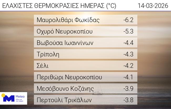 Κάτω από τους -6 °C έπεσε ο υδράργυρος το πρωί του Σαββάτου 14/03 στα ηπειρωτικά τμήματα της χώρας. Σύμφωνα με το δίκτυο αυτόματων μετεωρολογικών σταθμών του meteo.gr / Εθνικού Αστεροσκοπείου Αθηνών, η χαμηλότερη θερμοκρασία καταγράφηκε στο Μαυρολιθάρι Φωκίδας και ήταν ίση με -6.2 °C. Στον σχετικό πίνακα παρουσιάζονται οι 8 σταθμοί που κατέγραψαν τις χαμηλότερες θερμοκρασίες το πρωί του Σαββάτου 14/03.