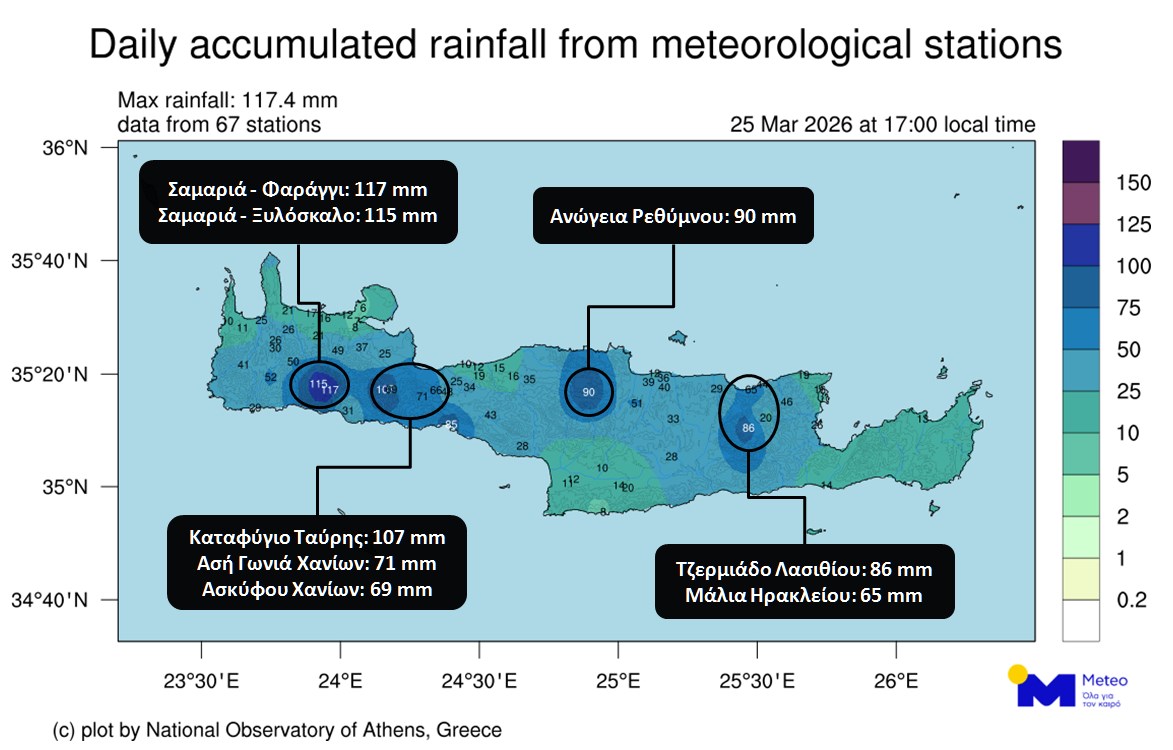 Σε συμφωνία με τα προγνωστικά στοιχεία του Εθνικού Αστεροσκοπείου Αθηνών / Meteo.gr τοπικά ισχυρές βροχές εκδηλώθηκαν κατά τη διάρκεια της Τετάρτης 25/03/2026 στην Κρήτη.