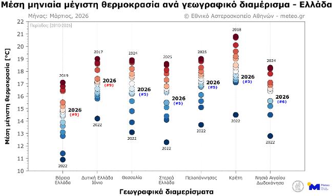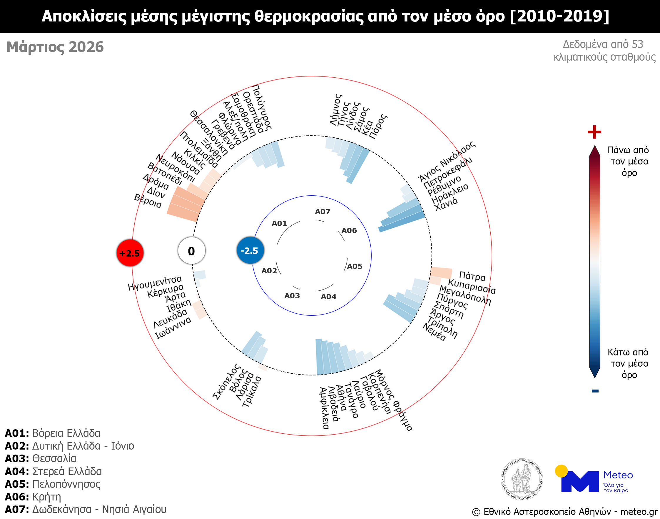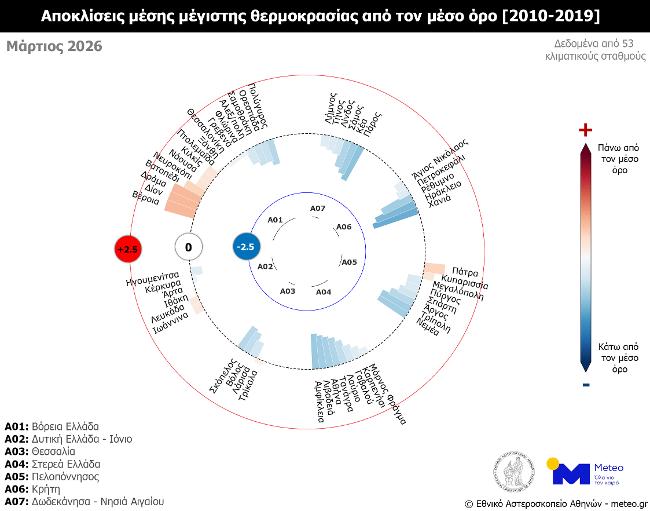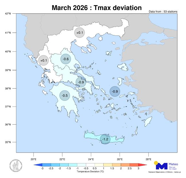Σύμφωνα με το δίκτυο των 53 μετεωρολογικών σταθμών του meteo.gr του Εθνικό Αστεροσκοπείο Αθηνών, το οποίο λειτουργεί αδιάλειπτα από το 2010, ο Μάρτιος του 2026 χαρακτηρίστηκε από χαμηλότερες του κανονικού τιμές της μέσης μέγιστης ημερήσιας θερμοκρασίας στις περισσότερες περιοχές της χώρας. Συγκεκριμένα, σε σύγκριση με τη μέση τιμή της περιόδου 2010–2019, αρνητικές αποκλίσεις καταγράφηκαν σε όλα τα γεωγραφικά διαμερίσματα, με εξαίρεση τη Βόρεια Ελλάδα και τη Δυτική Ελλάδα – Ιόνιο, όπου οι θερμοκρασίες διατηρήθηκαν ελαφρώς πάνω από τα κανονικά επίπεδα.
