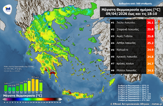 Περαιτέρω πτώση σημείωσαν οι μέγιστες θερμοκρασίες την Μ. Πέπμτη 09 Απρίλιου 2026 κυρίως σε τμήματα της βόρειας και ανατολικής ηπειρωτικής χώρας. Σύμφωνα με το δίκτυο αυτόματων μετεωρολογικών σταθμών του Εθνικού Αστεροσκοπείου Αθηνών / meteo.gr, η υψηλότερη μέγιστη θερμοκρασία καταγράφηκε στη Σκάλα Λακωνίας και ήταν ίση με 26.1 βαθμούς Κελσίου. Στον παρακάτω χάρτη παρουσιάζονται οι μέγιστες θερμοκρασίες στη χώρα μας έως τις 18:10 της Μ. Πέμπτης 09 Απριλίου 2026, ενώ στον πίνακα παρουσιάζονται οι 8 υψηλότερες μέγιστες θερμοκρασίες.