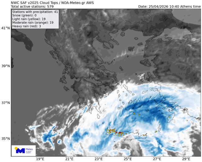 Συνεχίζονται οι βροχοπτώσεις στην Κρήτη αλλά κατά τόπους και στις Νότιες Κυκλάδες και στα Δωδεκάνησα, το πρωί του Σαββάτου 25/04. Στο Εθνικό Αστεροσκοπείο Αθηνών / meteo.gr παρακολουθούμε συνεχώς την εξέλιξη του καιρού χρησιμοποιώντας τόσο το πυκνό δίκτυο μετεωρολογικών σταθμών μας όσο και δορυφορικά δεδομένα και προϊόντα. Στον χάρτη της Εικόνας 1 παρουσιάζονται οι νεφώσεις στη χώρα στις 10:40, όπως αυτές καταγράφονται σε υπέρυθρο κανάλι του μετεωρολογικού δορυφόρου Meteosat-12 (με μπλε αποχρώσεις τα ψυχρότερα / υψηλότερα νέφη) καθώς και οι σταθμοί που καταγράφουν βροχόπτωση την ίδια στιγμή. Με κίτρινες, πορτοκαλί και κόκκινες κουκίδες σημειώνονται οι σταθμοί με ασθενή, μέτρια και ισχυρή βροχόπτωση αντίστοιχα. Μπορείτε να βλέπετε τους σχετικούς χάρτες σε σχεδόν πραγματικό χρόνο εδώ.